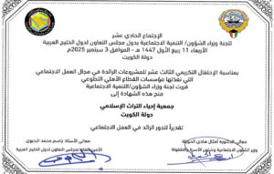 كرمت لجنة وزراء الشؤون ووزراء التنمية الاجتماعية لدول مجلس التعاون لدول الخليج العربية، جمعية إحياء التراث الإسلامي في دولة الكويت؛ وذلك تقديرًا لدورها الرائد في العمل الاجتماعي، وجاء ذلك في اجتماعها الحادي عشر الذي عقد مطلع هذا الشهر (سبتمبر 2025م)، وقد جاء هذا التكريم الذي حصلت بموجبه الجمعية أيضًا على كأس التميز بوصفها رائدة في العمل الاجتماعي بمبادراتها الخيرية في مشروع (سباق الخير)، الذي اختير مشروعًا رائدًا اجتماعيا على مستوى دول الخليج العربي، وقد استلم شهادة التميز والكأس رئيس مجلس إدارة جمعية إحياء التراث الإسلامي الشيخ طارق سامي العيسى ممثلاً عن الجمعية.