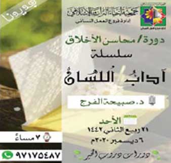 أما لجنة صباح الناصر النسائية فستقيم دورة في شرح (كتاب فضائل القرآن) للشيخ محمد بن عبدالوهاب، يقوم بالتدريس فيها الشيخ/ عبدالرزاق البدر، وهي خاصة بالنساء، وستستمر حتى نهاية الشهر الجاري، والدراسة فيها (3) أيام في الأسبوع؛ حيث سيكون في نهايتها اختبار اختياري للحصول على شهادة.