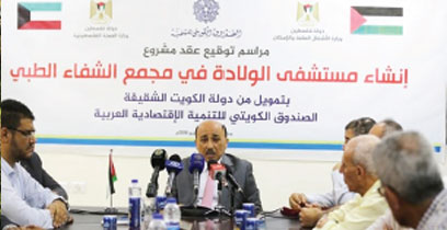 وقع وزير الأشغال العامة والسكان الفلسطيني مفيد الحساينة العقد الخاص بإعادة إنشاء مستشفى الولادة في مجمع (الشفاء الطبي) بقيمة 4 ملايين دولار، مقدمة من الكويت، وقال الحساينة خلال مراسم التوقيع: «نوقع عقد مشروع إنشاء مبنى الولادة في مجمع الشفاء الطبي بغزة، ضمن المنحة الكويتية لإعادة إعمار القطاع، هذا المشروع المهم والحيوي، الذي سيخدم سكان القطاع كافة، هو رسالة وفاء من الحكومة والشعب الكويتي الشقيق لأشقائهم الفلسطينيين، الذين يتعرضون يوميا للعدوان الإسرائيلي، ولاسيما ما يعانيه أبناء شعبنا في غزة من استمرار للحصار، وتدمير لجميع القطاعات الأساسية والحيوية من البنية التحتية، إلى المنشآت، والمرافق الصحية، والاقتصادية، ومراكز تقديم خدمات الجمهور، وسيقام مستشفى الولادة على مساحة إجمالية تبلغ 1500 متر مربع، وهي 3 أضعاف المساحة الحالية، وبتكلفة 4 ملايين دولار مقدمة من الصندوق الكويتي للتنمية الاقتصادية العربية..