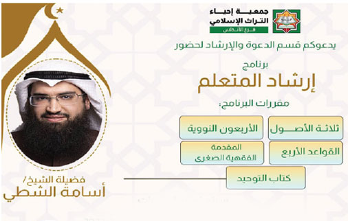 بدأ فرع إحياء التراث بمنطقة الأندلس يوم الثلاثاء الماضي برنامجا شرعيا بعنوان: (إرشاد المتعلم)، وستُدرس فيه الكتب الآتية: (ثلاثة الأصول -الأربعون النووية -القواعد الأربع -المقدمة الفقهية الصغرى - التوحيد)، وسيحاضر فيه الشيخ: أسامة الشطي، والدراسة فيه ستكون كل يوم ثلاثاء في تمام الساعة (7.30) مساءً في ديوانية اللجنة في منطقة الأندلس.