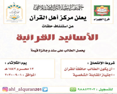 بدأ مركز أهل القرآن في منطقة الجهراء التابع لجمعية إحياء التراث الإسلامي العمل بحلقات الأسانيد القرآنية، التي سيحصل الطالب بعد اجتيازها على سند وجائزة تكريمية.