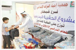 قام فرع خيطان التابع لجمعية إحياء التراث الإسلامي وجريا على عادته السنوية بتوزيع الحقيبة المدرسية لعدد ٥٠٠ طالب وطالبة تقريبا من الأسر المحتاجة؛ حيث تقدر قيمة الحقيبة الواحدة بـ ٥ د.ك، هذا وقد قام نائب رئيس الفرع يوسف الشداد وبمشاركة أعضاء الفرع الكرام بتوزيع الحقيبة في يوم الأربعاء ٦ / ٩ / ٢٠١٧م.