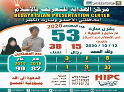 أوضحت جمعية إحياء التراث الإسلامي في تقرير لها بأن عدد المهتدين الجدد منذ بداية هذا العام بلغ (53) مهتديا ومهتدية من مختلف الجنسيات، في محافظتي الأحمدي ومبارك الكبير فقط، وذلك من خلال مشروع (بلغني الإسلام) الذي ينظمه مركز الهداية للتعريف بالإسلام هناك، وهم (15) رجلاً، و (38) امرأة.
