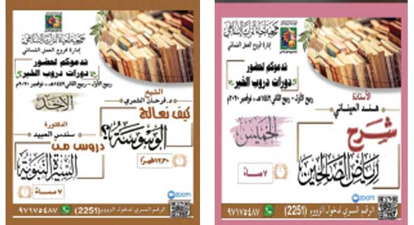 حيث سيتضمن البرنامج دورة في (كيف نعالج الوسوسة؟) للشيخ/ د. فرحان عبيد الشمري في الساعة (12٫30) ظهراً، وفي الساعة (7) مساء دورة في (السيرة النبوية) تلقيها د. سندس العبيد، وذلك كل يوم أحد. أما يوم الخميس فستكون فيه دورة في شرح (رياض الصالحين) تلقيها أ هند العيناتي في تمام الساعة (7) مساء. وأوضحت إدارة فروع العمل النسائي بأن جميع الدورات ستكون عبر البث المباشر(ZOOM) الرمز (2251). أما التسجيل فيها فسيكون عن طريق الواتساب (97175487). ودعت الإدارة النساء والطالبات للمشاركة في هذه البرامج والاستفادة منها في استغلال الوقت فيما يعود عليهن بالخير والمنفعة.