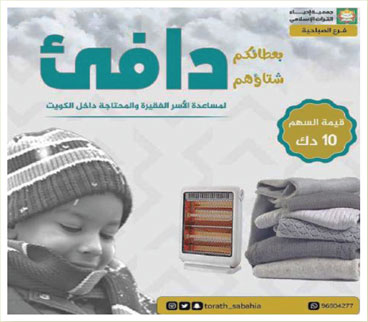 طرح فرع جمعية إحياء التراث الإسلامي في منطقة الصباحية حملة جديدة وفزعة خيرية باسم: (بعطائكم شتاؤهم دافئ)، التي يتم من خلالها توفير أجهزة التدفئة والبطانيات للأسر الفقيرة والمحتاجة داخل الكويت؛ حيث تبلغ قيمة المساهمة فيها (10) د.ك، ويشرف على هذه الحملة، وقد سبق للجمعية وأن طرحت حملات عدة لتوفير كسوة الشتاء للمحتاجين داخل الكويت عبر لجانها المختلفة، التي كان من آخرها حملة لتوفير كسوة الشتاء لـــ (1000) عامل فقير، فضلا عن توفير الكسوة لـــ (500) أسرة محتاجة.