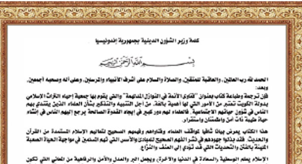 آمل أن يكون هذا الكتاب مفيدا في إثراء وجهات نظر المسلمين الإندونيسيين في خضم الجهود المبذولة لتنظيم الحياة الوطنية نحو مستقبل أفضل.