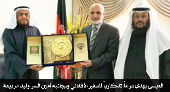 وفي ختام اللقاء قدّم الشيخ طارق العيسى رئيس مجلس الإدارة بجمعية إحياء التراث الإسلامي هدية تذكارية لسعادة سفير جمهورية أفغانستان لدى الكويت سيد جاويد هاشمي، وهي درع تذكاري وعدد من إصدارات الجمعية، ولاسيما الإصدارات الخاصة في مواجهة الانحراف الفكري، والغلو والتطرف.
